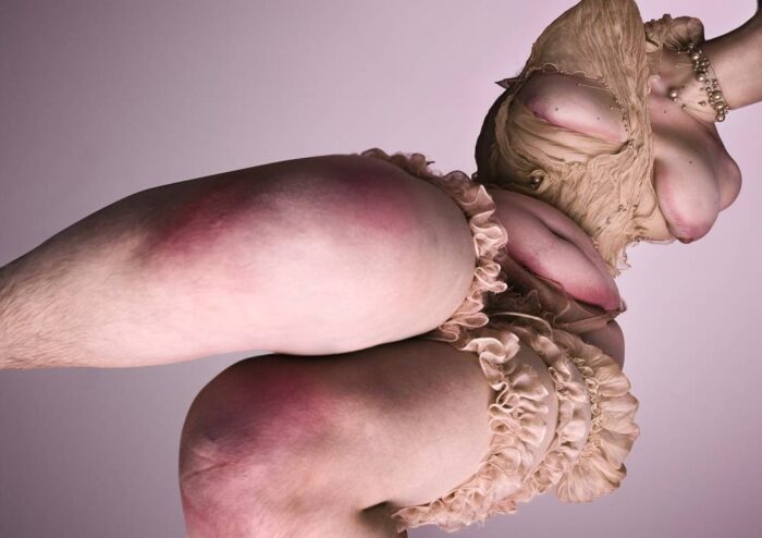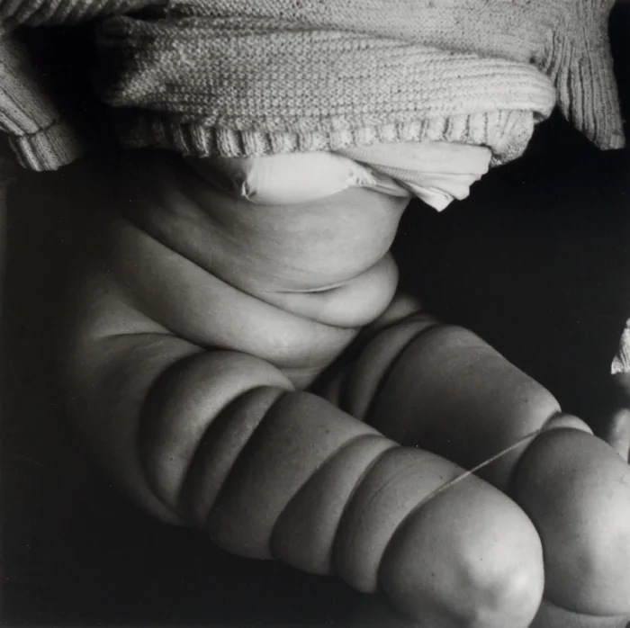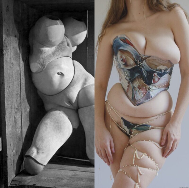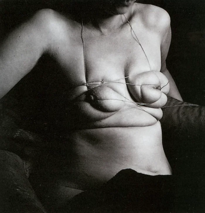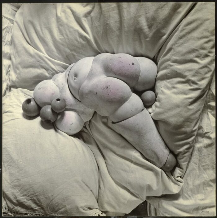 Dans ses créations, Bellmer projette ses fantasmes à travers des corps déformés et des organes sexuels contorsionnés. Le corps humain, en particulier féminin, est réinventé, démembré et réduit à ses courbes les plus élémentaires. Obsédé par la manipulation du corps, il impose à ses figures des poses suggérant à la fois soumission et abandon, dans une dynamique subtile de domination et de sadisme implicite. Sous son regard, le corps féminin n’est plus que courbes, sexes, et forme géométrique. Les courbes exagérées, souvent appliquées aux hanches et à la poitrine, accentuent les parties du corps associées au désir. Ce sont les contraintes et torsions imposées à ces corps qui confèrent aux poupées de Bellmer une charge érotique singulière. Ce processus de décomposition et de mise en tension illustre une vision violente du désir, où le plaisir semble indissociable de la domination, de la contrainte. Le sadisme de Bellmer ne réside pas seulement dans la manipulation physique de la poupée, mais aussi dans le fantasme de la soumission du corps féminin à son propre désir.
