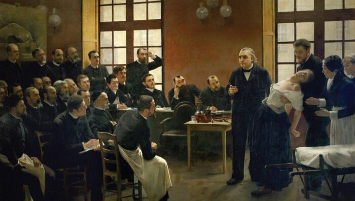 Une leçon clinique à la Salpêtrière, tableau d’André Brouillet, 1887. Le médecin Jean-Martin Charcot donne une leçon clinique à l’hôpital de la Salpêtrière à Paris, devant un parterre d’une trentaine de spectateurs. Il reproduit chez sa patiente Blanche wittman sous hypnose, la symptomatologie d’une crise d’hystérie.