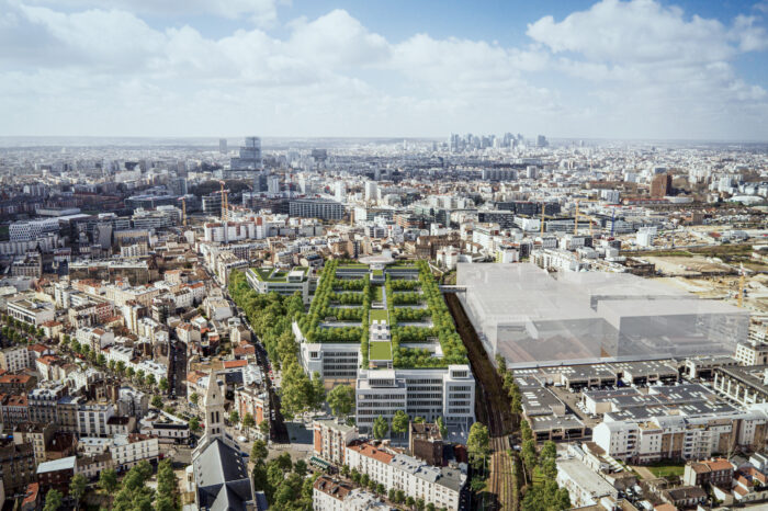 Treize bâtiments interconnectés, chacun ajouré de patios végétalisés, favorisant lumière naturelle, ventilation et agrément visuel.