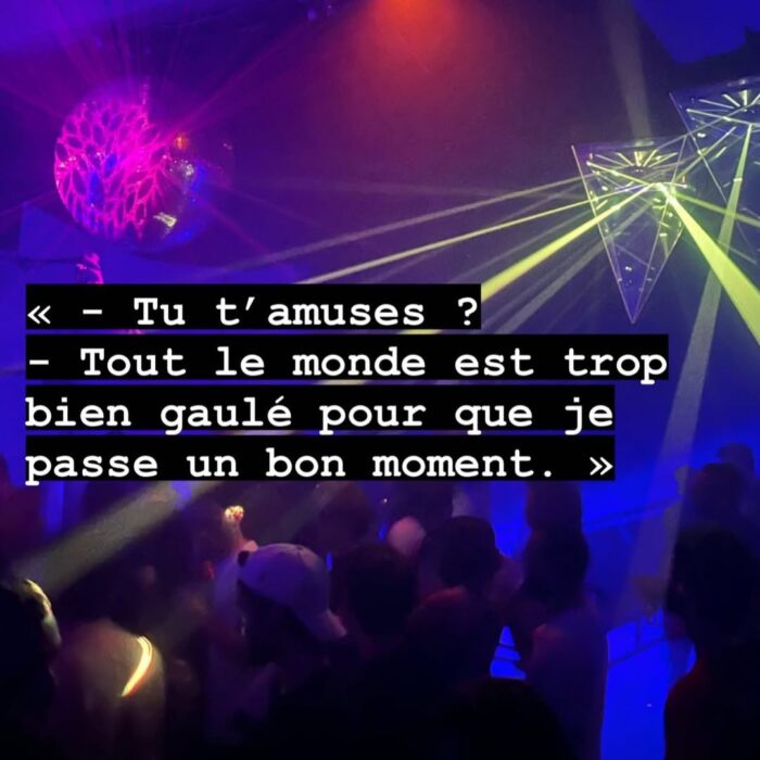 Nous allons en soirée ou en festival alors que nous ne nous y sentons pas vraiment à notre place, tout ça pour danser avec des types qui ressemblent à des dieux grecs — alors qu’en vérité, ils n’ont pas mangé depuis trois jours et prennent assez de stéroïdes pour alimenter une ville entière.